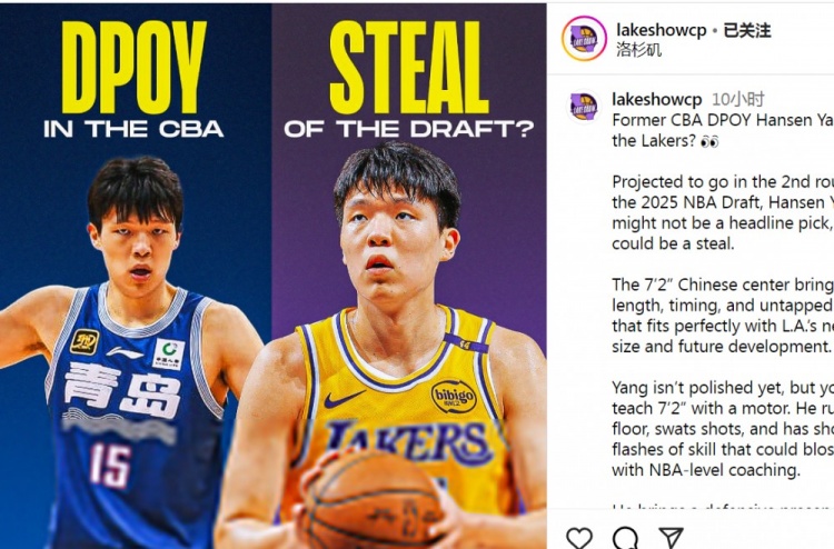 Lakeshow写道:“前CBA最佳防守球员杨瀚森有望加盟湖人? 预计在2025年NBA选秀第二轮被选中的杨瀚森可能不会成为头条新闻,但他可能会成为一个意外之喜。这位身高7英尺2英寸(2.18米)的中国中锋拥有顶级的臂展、时机把握能力和尚未开发的巨大潜力,完美契合了湖人在球员身高和未来发展方面的需求。”
