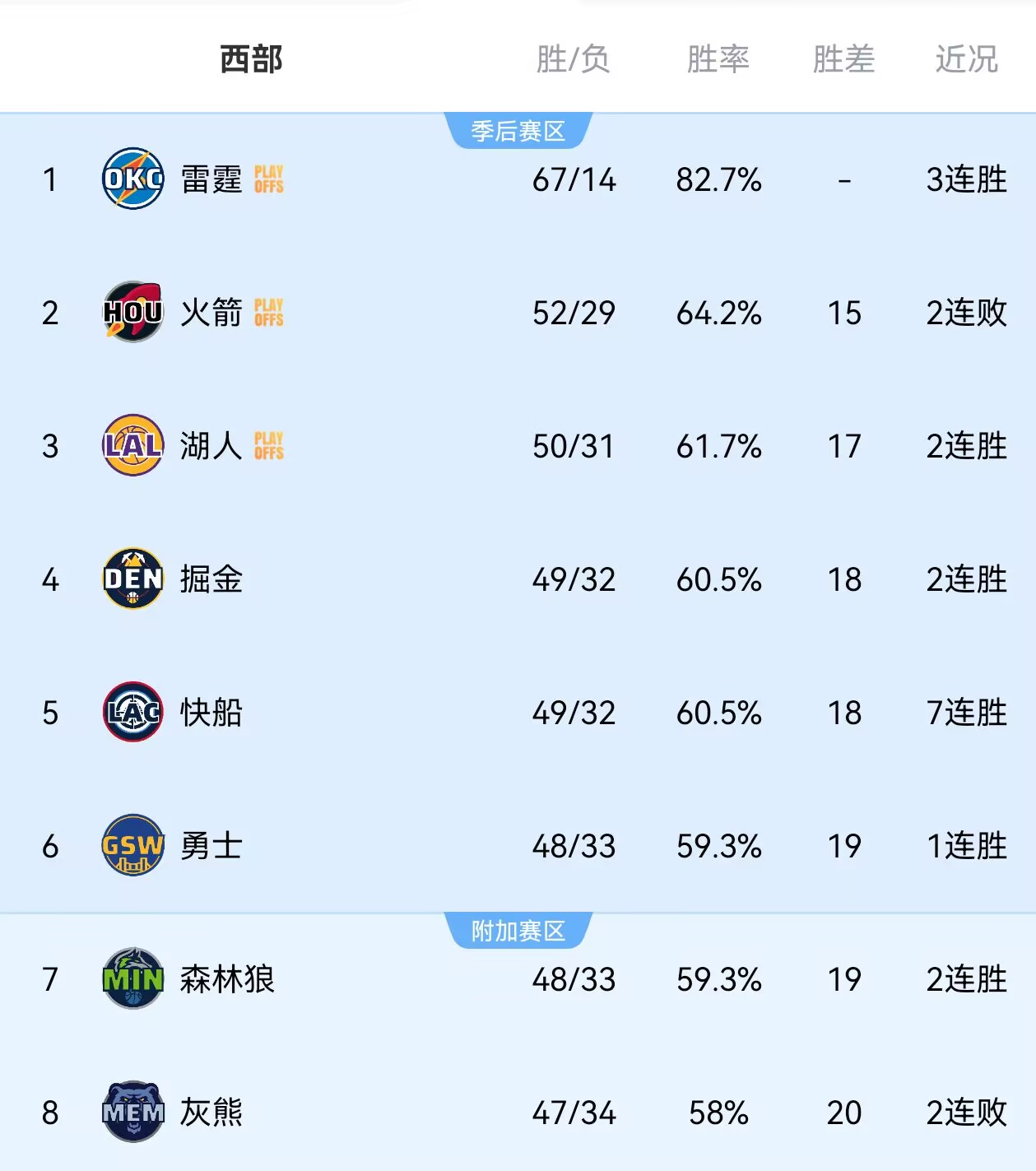 - 快船(4)、掘金(5)、勇士(6)、灰熊(7)、森林狼(8)
