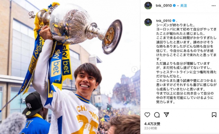 5月8日讯 2024/25赛季英冠联赛已落下帷幕,利兹联凭借净胜球优势力压伯恩利夺冠,将重返英超联赛。日本中场田中碧在加盟球队首赛季便坐稳主力并帮助球队升超,下赛季也将是他旅欧以来首次征战一级联赛。