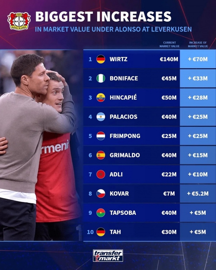 阿隆索执教期间勒沃库森球员德转身价上涨排名(括号内为目前身价):