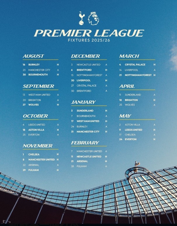 6月18日讯 英超官方公布新赛季赛程,热刺方面,球队首轮对阵伯恩利,11月连战切尔西、曼联、阿森纳,下半程连战曼城、曼联、纽卡、阿森纳。