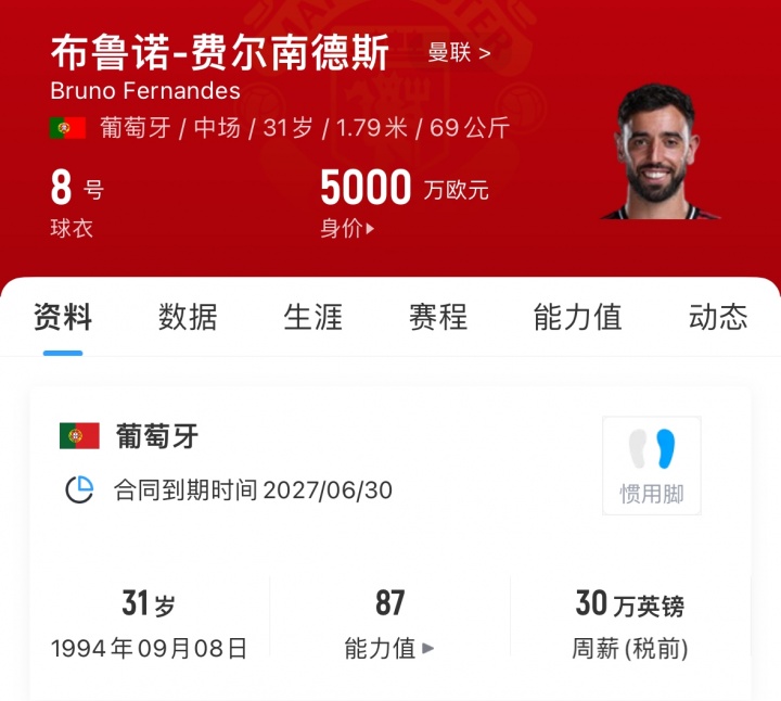 B费现年31岁,他与曼联的合同到2027年到期,他现身价5000万欧,他在曼联的周薪为30万镑。据罗马诺报道,今夏,曾有沙特球队1亿镑报价B费,并提供三倍薪水的合同,但B费选择留队。