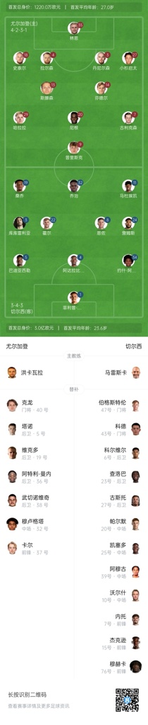 切尔西首发:12-约根森、34-阿奇姆彭、4-阿达拉比奥尤、5-巴迪亚西勒、3-库库雷利亚、24-詹姆斯、22-霍尔、11-马杜埃凯、8-恩佐、19-桑乔、32-乔治