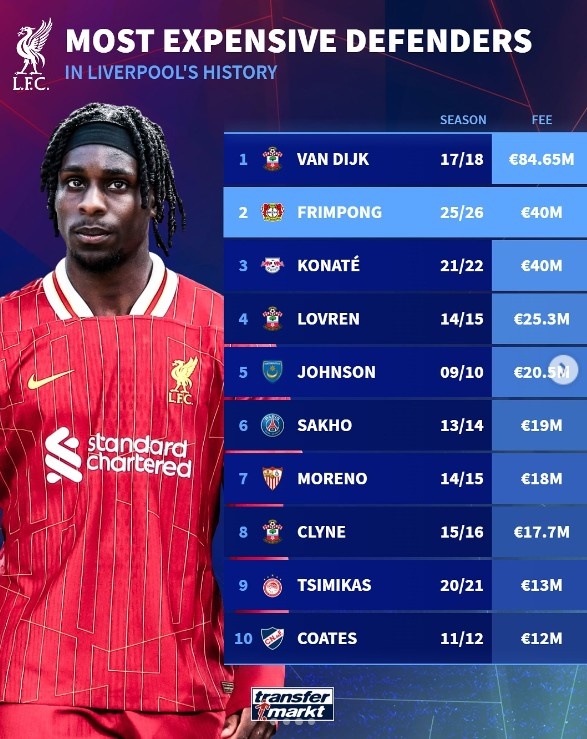 以下为利物浦队史后卫引援转会费top10: