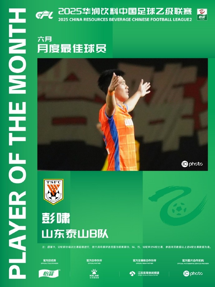中乙联赛6月的赛事中,山东泰山B队取得了2胜2平的不败战绩,19岁的后卫彭啸打入4球。在第13轮客场2比1击败湖北青年星的比赛中,彭啸在球队落后的情况下先是主罚任意球破门扳平比分,随后在第84分钟打入制胜球;在第14轮2比2战平兰州陇原竞技的比赛中,彭啸上演梅开二度,两度帮助球队领先,并且连续两场比赛主罚任意球破门。