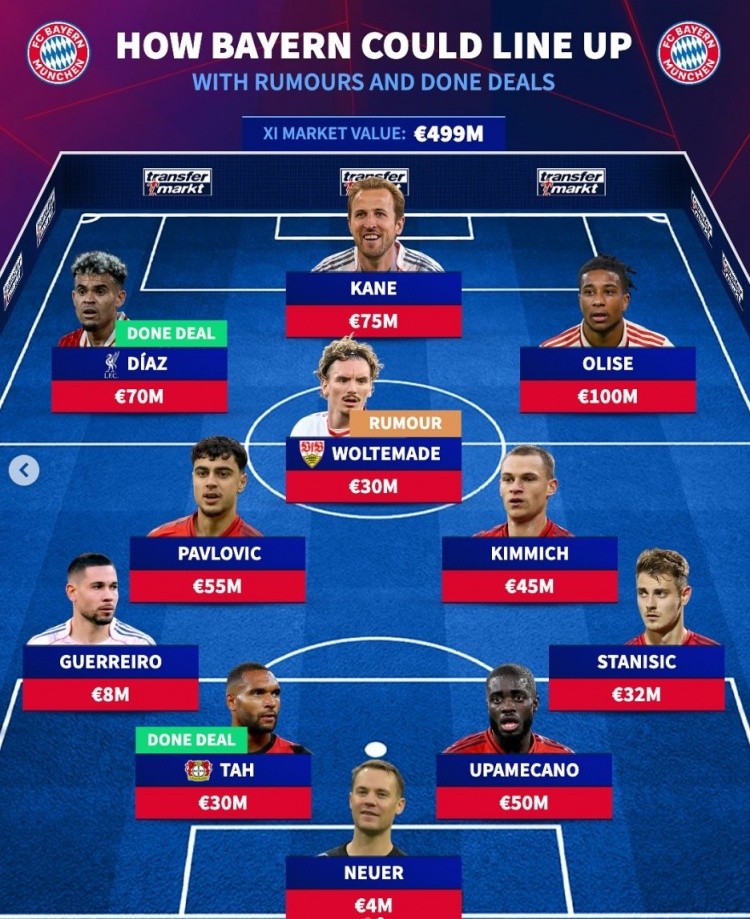 7月30日讯 拜仁已经官宣签下利物浦边锋路易斯-迪亚斯,在穆西亚拉和戴维斯重伤半年的情况下,《转会市场》也据此预测了拜仁新赛季的主力阵容。