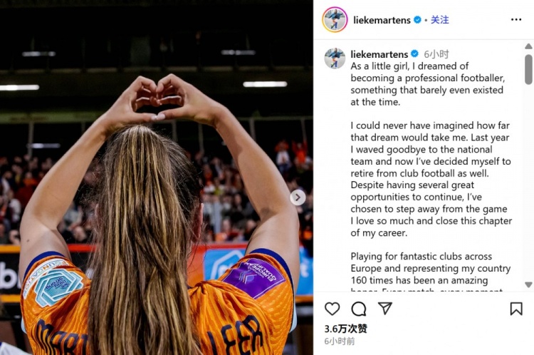 9月2日讯 荷兰女足的32岁前锋列克-马滕斯通过社媒发文,宣布退役。她曾效力过巴萨和巴黎在内的多家欧洲俱乐部,并随荷兰女足获得2017年欧洲杯冠军和2019世界杯亚军,她也当选为当年的世界足球小姐。