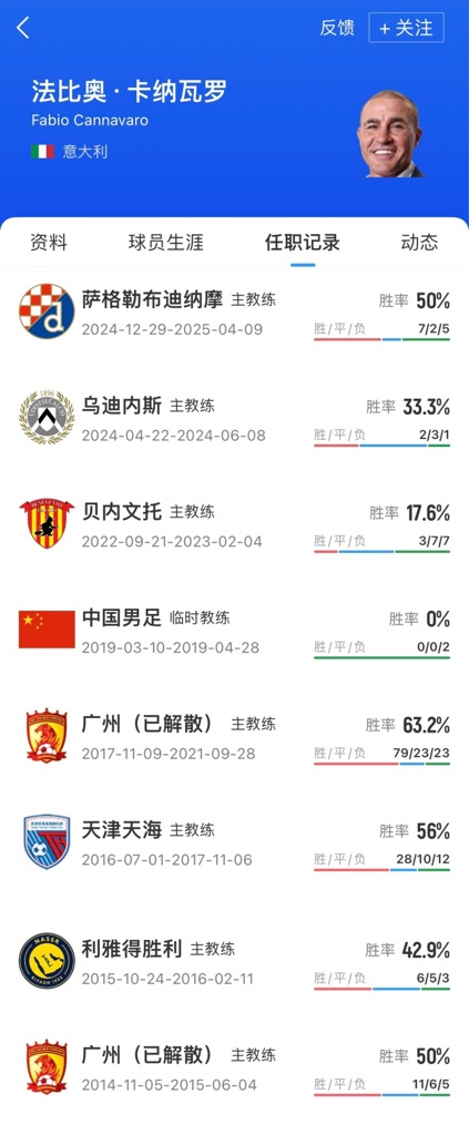 卡纳瓦罗现年51岁,曾执教广州恒大、利雅得胜利、天津权健、贝内文托、乌迪内斯和萨格勒布迪纳摩。2019年3月-4月,卡纳瓦罗曾出任国足临时主帅,带队征战中国杯,2场比赛均以0-1的比分不敌乌兹别克斯坦和泰国队。